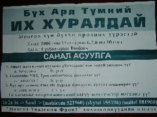「急進的改革」、「健全な社会のための市民運動」、「我がモンゴルの地」、「全モンゴル」、「老人自由同盟」などが「モンゴル民族戦線」を結成し、11月6日から8日までの3日間、スフバートル広場で、「全国民大集会 Бvх ард тvмний их хуралдай」を開催した。