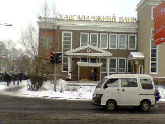 (貯蓄銀行。南隣にモンゴル国立銀行、ウランバートル・シティ銀行、北斜め向かいに商業発展銀行本店、東にゴロムト銀行本店などがある。筆者写)