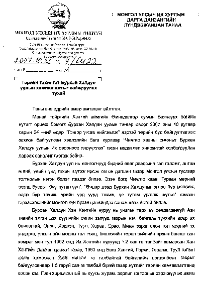「ヘンティー・アイマグの史跡保存」を求める国会議長への2007年10月25日付上申書の一部。筆者蔵)