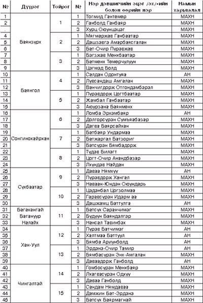 ウランバートル市では、人民革命党は、スフバータル区、ナライフ区、バガハンガイ区で勝利し、民主党はハンオール区で勝利した。