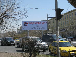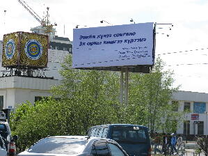 (注:エンフバヤルの選挙看板。「団結と『祖国の贈り物』」とある。モンゴル国立大学2号館交差点西側)