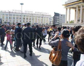 例えば、エルベグドルジ支持者たちは、2009年5月25日、スフバートル広場で祝賀集会を開いた(注:この「集会」は、ウランバートル市に無届けである可能性があるが、筆者は無確認))。その時、ハンオール区在住の一青年は、エルベグドルジに向かって、履いていた靴を投げつけた。