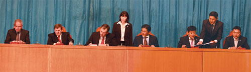 (注:ウヌードゥル新聞2009年10月7日付より。向かって左3人が外資側、右3人がモンゴル側Д.ゾリグト、С.バヤルツォグト、Л.ガンスフ)