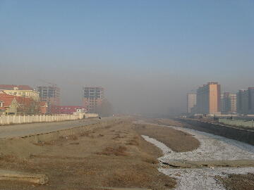 (注:凍結したセルベ川より北の方、スフバータル区第7地区を望む。ゲル地区のある遠方が見えない。筆者写)